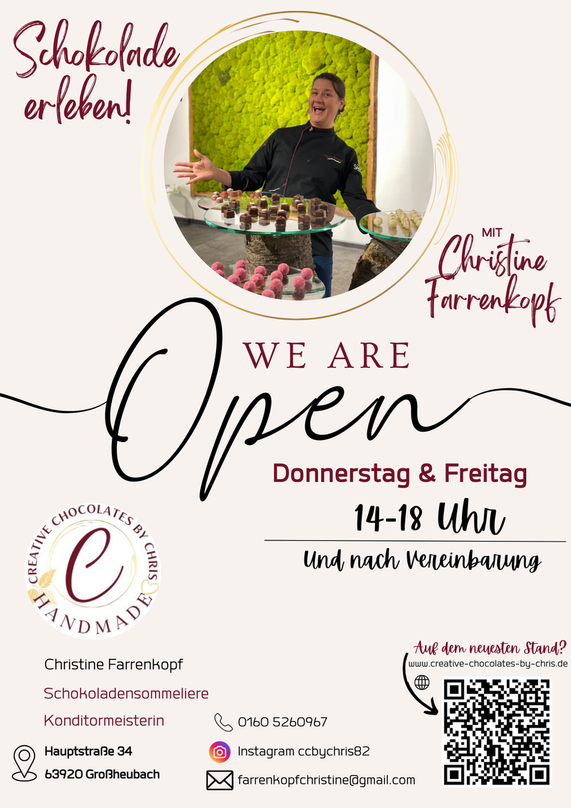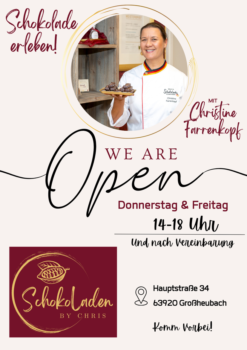 Der Fachbereich Schokolade hat mich in seinen Bann gezogen und bis heute schlägt mein Herz für die Schokoladenwelt. Diesen Enthusiasmus möchte ich gerne mit euch teilen. Am besten schmeckt ihr mein Herzblut in meiner eigenen Schokoladenreihe oder in den handgefertigten Pralinen. Besucht mich im neuen Schoko Laden im Herzen von Großheubach. Überzeugt euch selbst von meiner Leidenschaft in meinen Produkten!